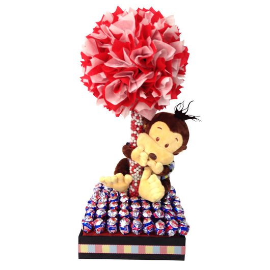 Contenido: 1 Chango de peluche de 25cm; 1 Base de madera color chocolate; 1 Tubo de cristal; 300g de chocoretas; 74 Paletas Tutsi Pop.