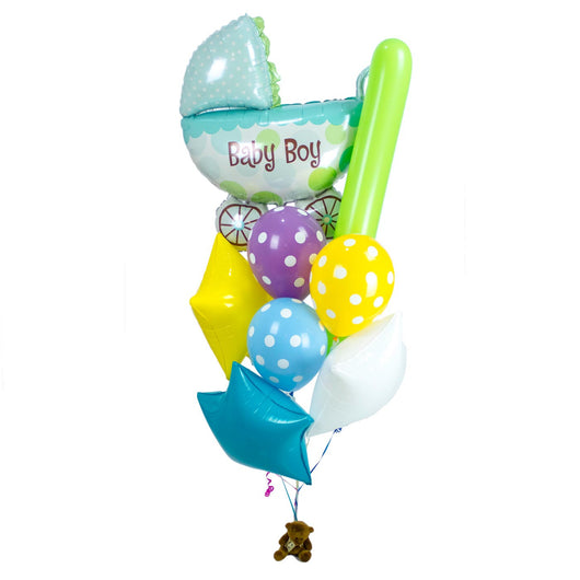 Contenido: 1 lobo de 28" en forma de carreola; 1 globo largo de látex de 12"; 3 globos polka de látex; 3 globos en forma de estrella de 18"; 1 osito de peluche.